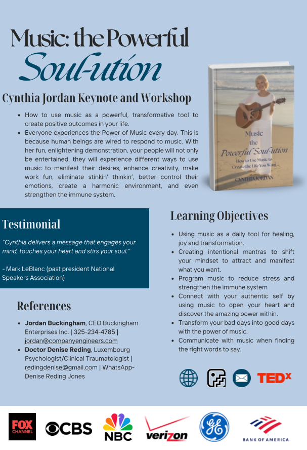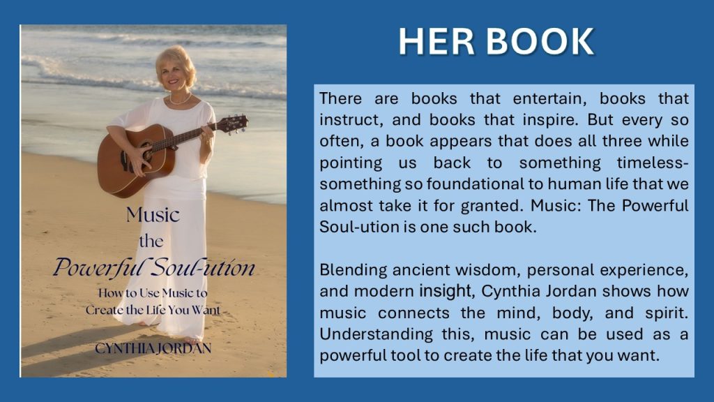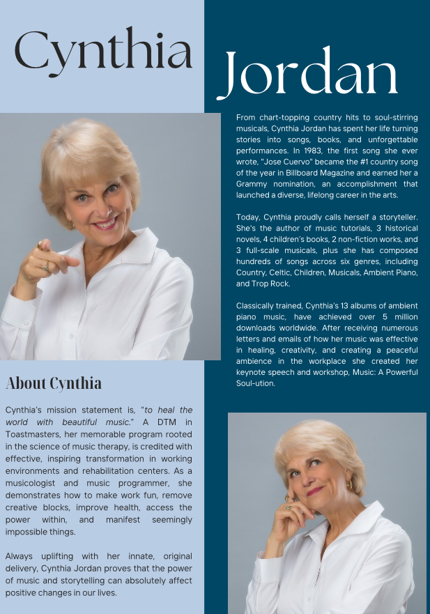 Looking for music for your event? Cynthia knows hundred of songs. She began her career as a songwriter with her number one song, Jose Cuervo. Now she calls herself a storyteller with keynotes, music and books.